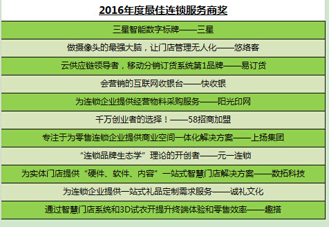本次峰會現(xiàn)場的頒獎環(huán)節(jié)更為引人矚目。以名創(chuàng)優(yōu)品、西貝、漢堡王、海底撈、百果園等為代表的全國,乃至全球的知名品牌商榮登“2016年度中國高成長連鎖50強”榜單;“2016年度更具潛力連鎖之星”則分別被望湘園、永和豆?jié){、新加坡媽媽烤包、喜來快遞、大腦地圖等優(yōu)質(zhì)連鎖企業(yè)奪得;開心麗果、漢堡王、名創(chuàng)優(yōu)品、麥多、皇家雞排等則獲得“2016年十大更值得加盟連鎖品牌”;而“2016年十大更受消費者喜愛門店”則“花落”鯊魚先生博物館、木屋燒烤、cityzoo、popmart、精悅?cè)嘏M艿壬碳?好享家、新發(fā)則、凱蘭帝等為代表的連鎖行業(yè)“新勢力”毫無疑問地拿到了“2016年度商業(yè)模式創(chuàng)新獎”。