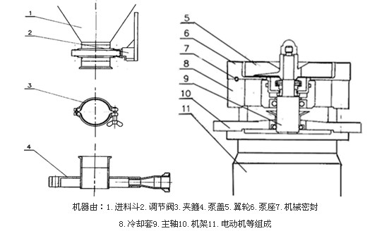 本機(jī)中與物料接觸的部分采用耐蝕不銹鋼材料。符合食品衛(wèi)生的要求。該機(jī)的工作是靠聯(lián)結(jié)在封閉電動機(jī)不銹鋼套軸上的翼輪來達(dá)到混合的目的,并由不銹鋼彈簧、壓緊密封圈、密封圈等組成機(jī)械密封裝置,進(jìn)料斗與泵體用夾緊箍連接,電動機(jī)與泵座用螺栓連接在機(jī)架上,整機(jī)可作任意移動,可以不用固定的安裝基礎(chǔ)。