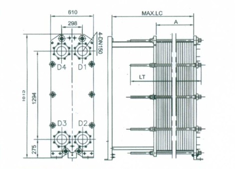 板式換熱器是由固定擋板、板片、移動(dòng)擋板、立柱、上導(dǎo)軌、下導(dǎo)軌及固定螺栓組成。在固定擋板及移動(dòng)擋板之間是一系列被固定的板片。每片板片均有墊圈,所以板片間構(gòu)成相互平行的封閉流道,介質(zhì)在每?jī)蓧K板片之間交替流動(dòng)。