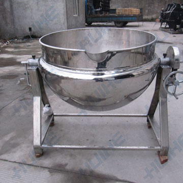 燃?xì)鈯A層鍋:就是人工打開氣閥,點(diǎn)燃燃?xì),加入食用油,待油溫達(dá)到烹飪溫度時,加入適量的物料,人工翻鍋、攪拌,使物料在鍋里均勻受熱。待物料加工完畢后,關(guān)氣熄火,轉(zhuǎn)動手柄,通過蝸輪、蝸桿傳動裝置,使鍋體旋轉(zhuǎn)傾斜,將物料倒入另一容器內(nèi)。