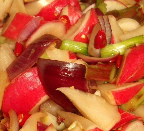 5)櫻桃蘿卜大一點(diǎn)的對(duì)半切開,生姜切片,芹菜切段。