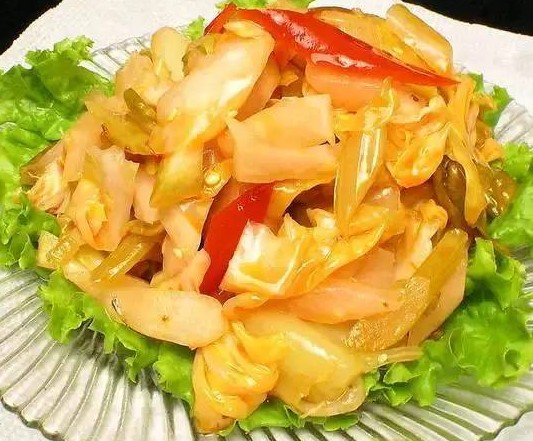 做法:1)圓白菜洗干凈,用手掰成小塊,黃瓜洗凈,切成稍厚一點(diǎn)的片, 將小塊的圓白菜和切成片的黃瓜放入大盆中,灑入食鹽,拌勻,進(jìn)行腌制。